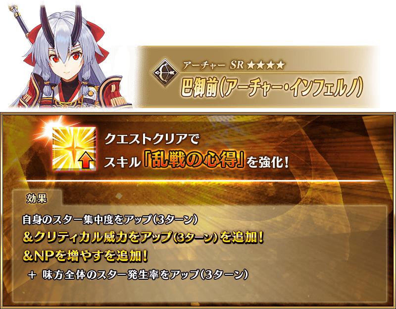 巴御前にNP30%チャージ追加!S2強化でクリ殴り性能が大幅アップ