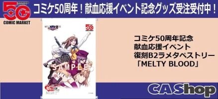 コミケ50周年を記念して初期の献血応援イベント話題になった限定ポスターをラメ入りタペストリーとして復刻。C81第1回で協力されたTYPE-MOON「MELTY BLOOD」も復刻グッズとして受注販売
