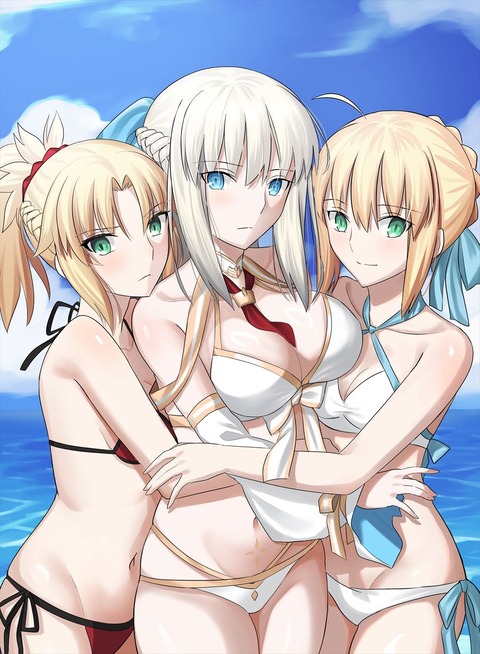 水着のモルガン様&アルトリア&モーさん!! 水着で寄り添い合ってる三人いいですね!!