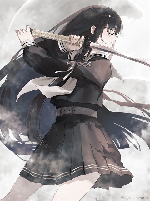 制服姿の黒姫さんイラスト!! 刀を構えた黒姫さんかっこいいです!!
