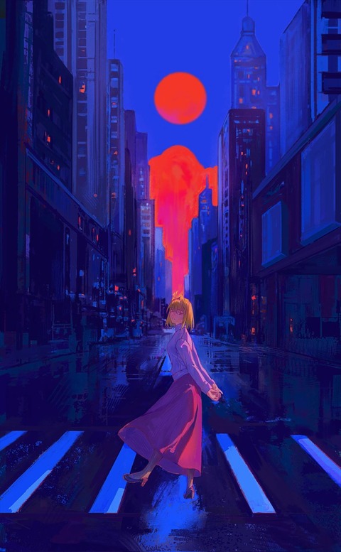 夕暮れの街とアルクイラスト!! 赤青の街がいいですね!!