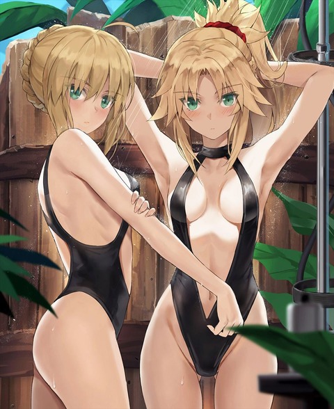 いっしょにシャワー浴びてるモーさん&アルトリア!! セクシーな水着いいですね!!