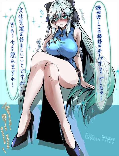 チャイナドレスのモルガン様イラスト!! 照れてるモルガン様いいですね!!