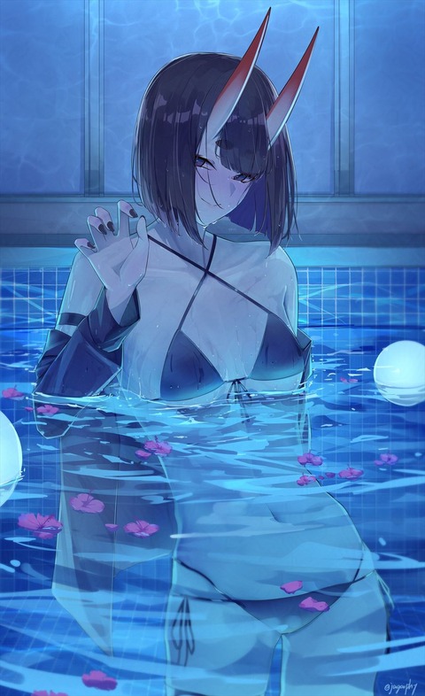 夜のプールと酒呑ちゃんイラスト!! 黒ビキニが素敵です!!